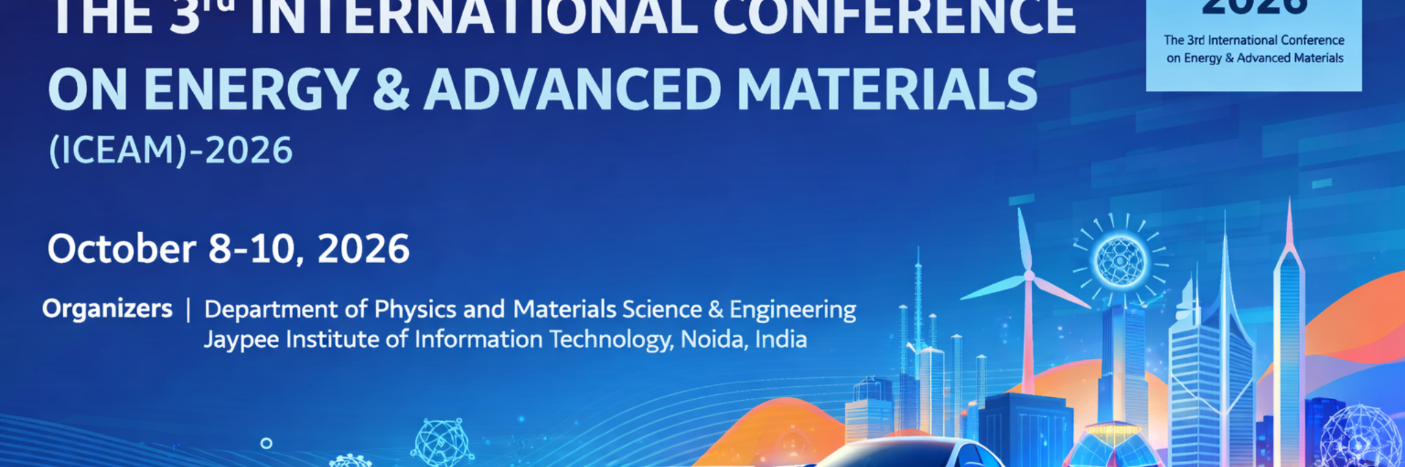 The International Conference on Energy and Advanced Materials (ICEAM‑2026) will be held at Jaypee Institute of Information Technology, Noida, India. The conference brings together researchers working in renewable energy, advanced materials, nanotechnology and electronic devices.